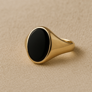 טבעת אוניקס לגבר – בדרך כלל מגיעה בעיצוב עוצמתי עם אבן אוניקס מלוטשת במרכז, משובצת במסגרת זהב צהוב או כסף מבריק. היא משדרת יוקרה, ביטחון ונוכחות – תכשיט שמושך תשומת לב מבלי להיות ראוותני מדי.