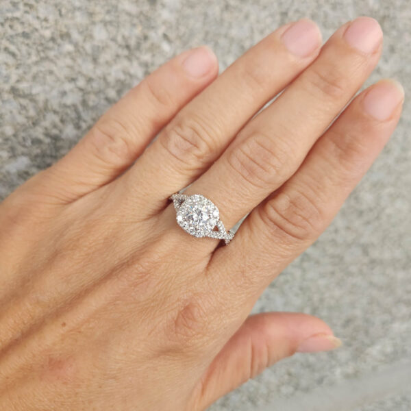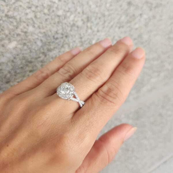 A highly prestigious and sparkling engagement ring features a 1.00ct lab diamond center and 52 small lab diamonds, an engagement ring with a presence that will make an impression. A big ring that full of diamonds but very elegant. The diamonds around the center diamond are larger than usual, which strengthens the center diamond and the entire ring. Total diamonds 1.80 carats.