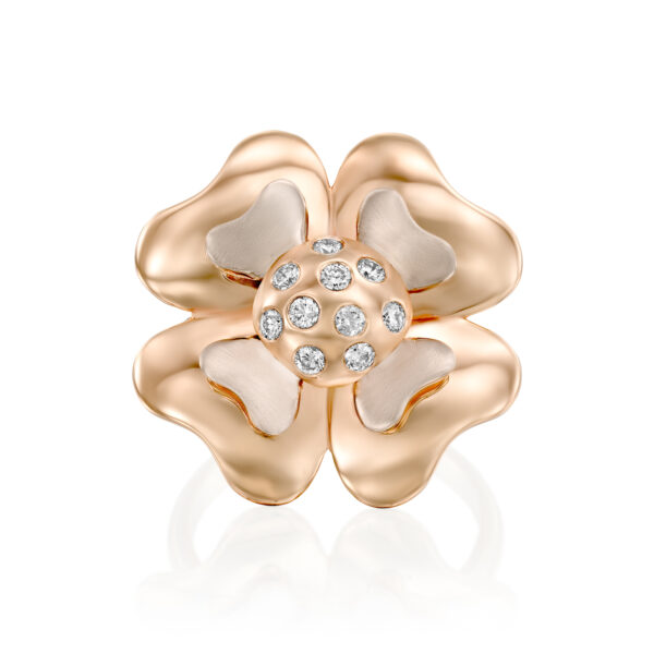 A large and impressive flower diamond ring, in the center of which are inlaid white diamonds weighing 0.28 carats in total. A fashionable and special diamond ring designed as a flower with two sets of petals, small and large that give it a unique look.