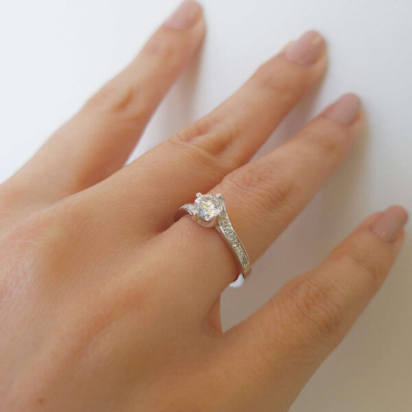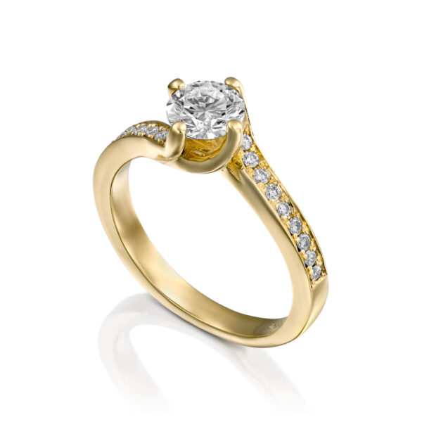 טבעת אירוסין יהלום 1 קראט טוויסט מרשימה משובצת במרכז יהלום 1.00 קראט ו-18 יהלומים בצדדים 0.14 קראט סך הכל. טבעת אירוסין אלגנטית אך לא שיגרתית, מבליטה את היהלום במרכז אך לא גורמת לו לבלוט יותר מידי החוצה. משקל יהלומים כולל 1.14 קראט.