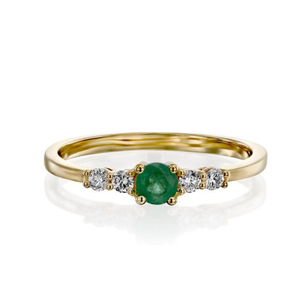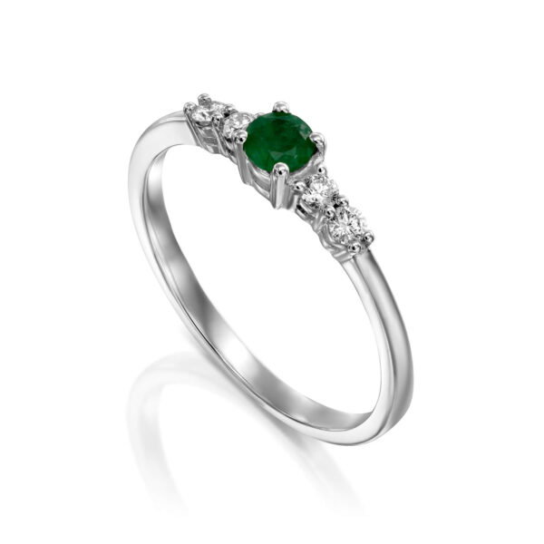טבעת יהלומים עדינה ואלגנטית משובצת במרכז אמרלד ירוק מבריק ושני יהלומים בכל צד. טבעת יהלומים צבעונית בעלת מראה נקי ונעים, מתאימה לנשים צעירות שרוצות משהו עם נוכחות מעודנת.