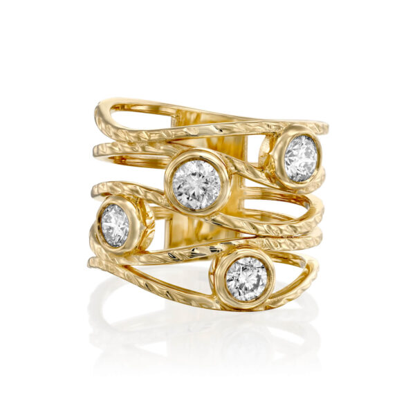 טבעת יהלומים מיוחדת בסגנון ארט נובו משובצת 4 יהלומים גדולים 1.00 קראט סך הכל. טבעת יהלומים בעלת נוכחות מרשימה ויחד עם זאת משדרת קלילות בזכות החוטים הדקים והגליים שהם חלק מהעיצוב שלה.